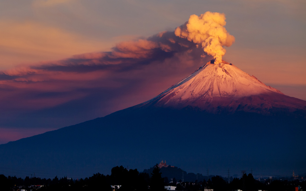 Il Popocatépetl è un vulcano in attività, situato nella regione di Puebla, a 70 km a sudest di Città del Messico. Il suo nome, che in lingua nahuatl significa ‘montagna (tepētl) che emette fumo di continuo (popōca)’, è dovuto alla sua moderata, ma costante, attività. È il secondo vulcano più alto del Messico, con un'altezza di 5 465 m s.l.m ed è uno dei vulcani più attivi dello stato.